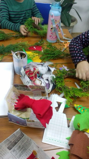 2014年12月のこども造形教室ではクリスマスリースを作りました。 一日目はリースに飾るオーナメントをフェルトと毛糸で作りました。 針と糸を持って、フェルトで誰かへのプレゼントを作り始める子も・・・ 二日目には生のセッカンスギとゴールドクレストを使ってリースを作ります。 そこに、自分の好きなテーマで作ったオーナメントを飾りました。 クリスマスリースの出来上がりです。先月nicco先生と作ったアドベントカレンダーとともにクリスマスまでの一日一日を楽しみながら待つことができたかな・・・?