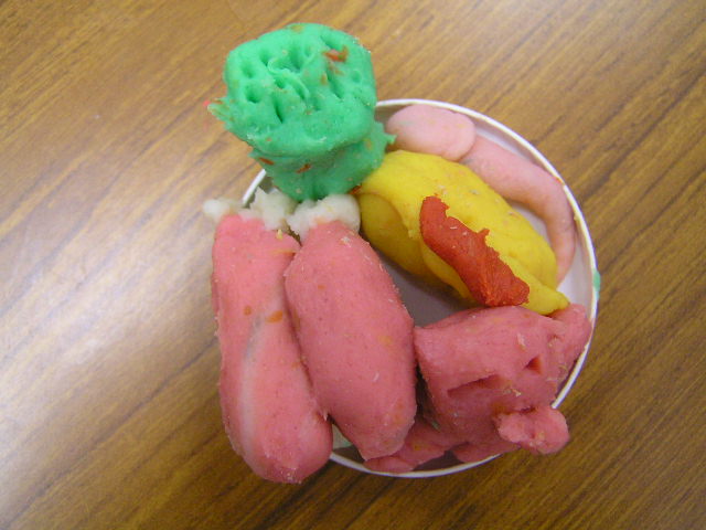 そして、第2回目、nicco先生が小麦粉粘土を作ってきてくれました。なんとなく温かい小麦粉粘土を小分けにして、食紅で色をつけます。