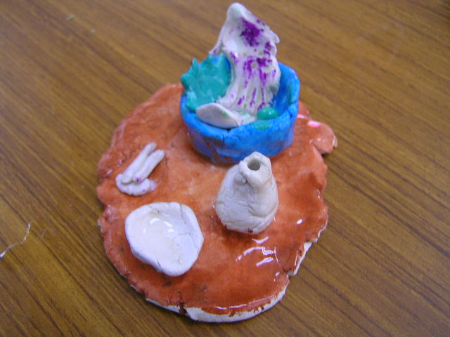 作りたい物のイメージが出来ると、好きな色の粘土を手にとり、作り始めます。もう夢中です。おいしそうにあふれてきているイチゴクリームや、何層にもなったケーキ。